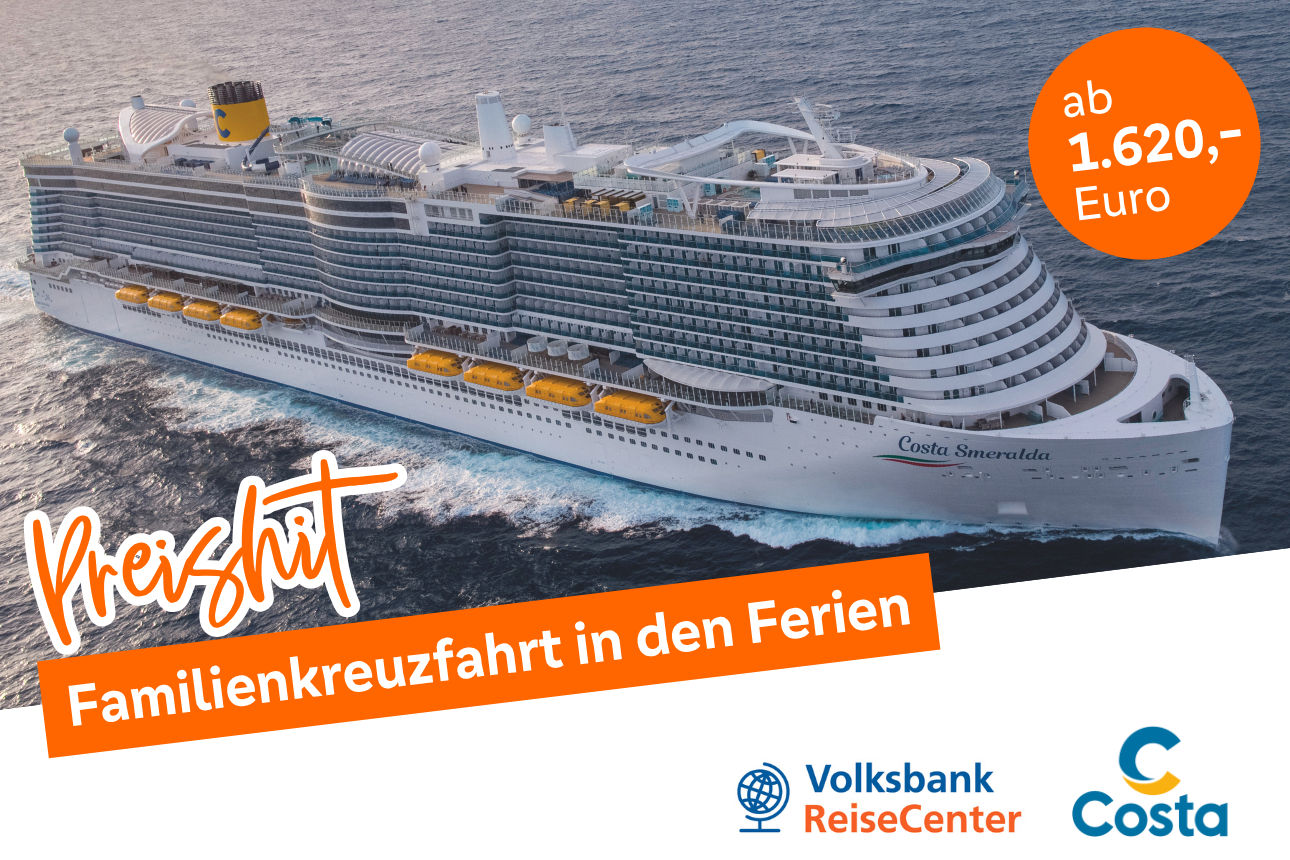 Familienkreuzfahrt in den FerienCosta Smeralda ins westliche Mittelmeer30.05. – 06.06.2026 & 05.09. – 12.09.2026ab 1.620,- Euro pro Familie (2 Erwachsene + 2 Kinder)Ausführliche Informationen als PDF-Datei